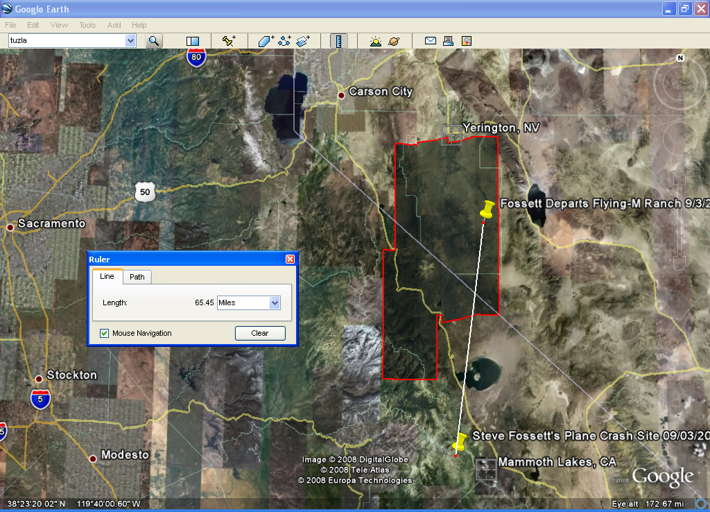 The latest version of Google Earth has a Ruler feature that allows you to measure distance between points in Google Earth. So, I measured and the distance from the Flying-M Ranch to the crash site is exactly 65.45 miles, as the crow flies.
