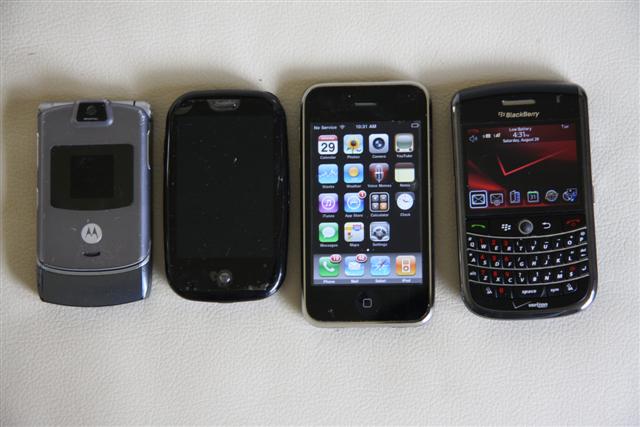 I have more phones than I know what to do with. These are (from your left to to your right) a V3C RAZR (Verizon), a Palm Pre (Sprint), an iPhone 3GS 32Gig (AT&T), and a Blackberry Something-or-Other® that's not sure what time it is that cost about five hundred clams.