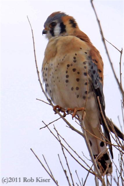 Above: Male American Kestrel. This American Kestrel is easily identified as a male by the blue leading edge on the wings and the very pronounced black spots on the chest.