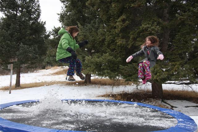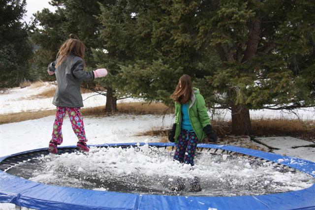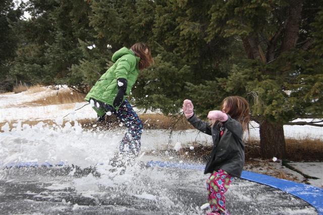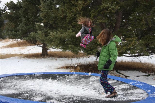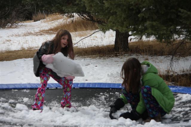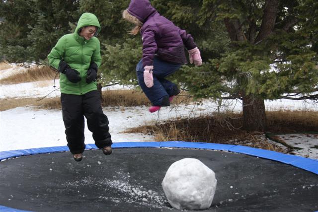 Here's some shots of the girls playing this weekend. The snowman on the trampoline is named "Stanley" apparently.