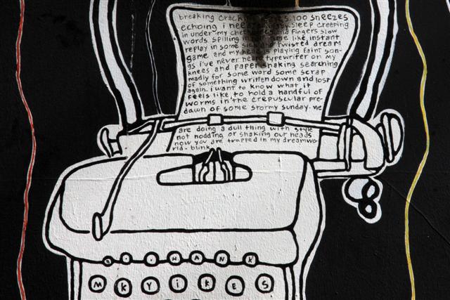 "breaking cracking leaves. 100 sneezes echoing i need a lulaby[sic]. sleep creeping in under my cheekbones and fingers slow words spilling in half time like instant replay in some sick and twisted dream game and my head is playing faint songs I've never heard. Typewriter on my knees and paper shaking searching madly for some word some scrap of something written down and lost again. I want to know what it feels like to hold a handful of worms in the crepuscular predawn of some stormy sunday. we are doing a dull thing with style not nodding or shaking our heads now you are trapped in my dreamworld. blink"