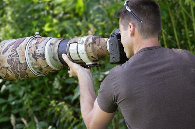 Last night I finally broke down and shelled out a few clams for a new lens, the Canon EF 600mm f/4 L IS USM Super Telephoto Lens. This is a large lens, as in ginormous. Here's a photo of a guy shooting it freehand. I'm pretty stoked.