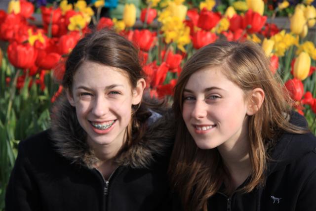 Above: Girls posing before planters of Red and Yellow Tulips at Fisherman's Wharf.