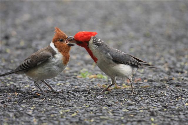 Above: Male Red-crested Cardinal (Paroaria coronata) feeding female in courting ritual at Sea Life Park on Oahu.