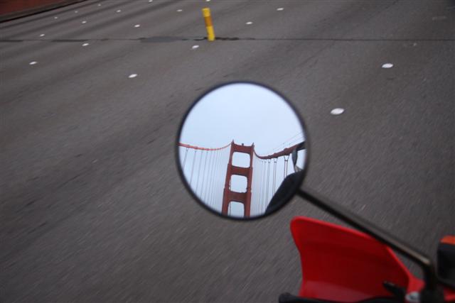 Above: Don't try this at home...shot of Golden Gate in motorcycle mirror while driving across the Golden Gate bridge with no hands.