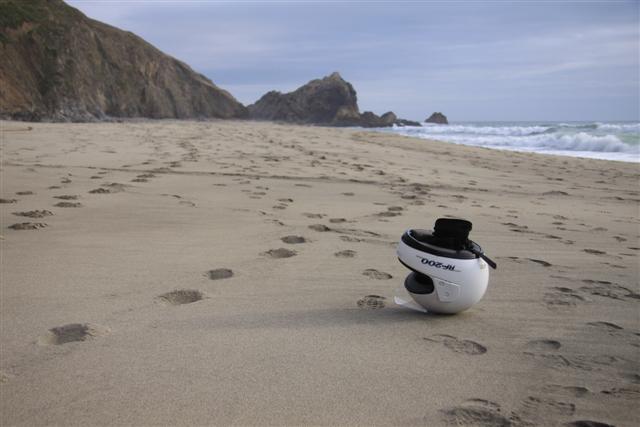 I should mention that I'm wearing all of my new motorcycle gear, so I look like Robocop. I'm wearing black motorcycle jacket and pants, black gloves, and a white helmet. I didn't' take it off because that's a whole other deal. It means removing gloves and glasses and then you have a helmet to carry, so much of the time, I just leave it on. Plus, I look super bad ass walking down the beach in black with a motorcycle helmet on.