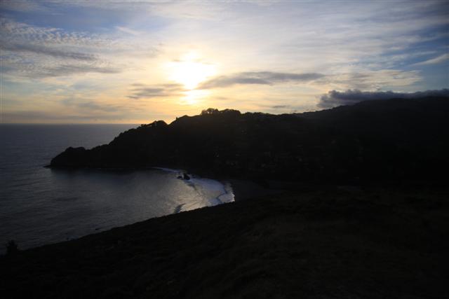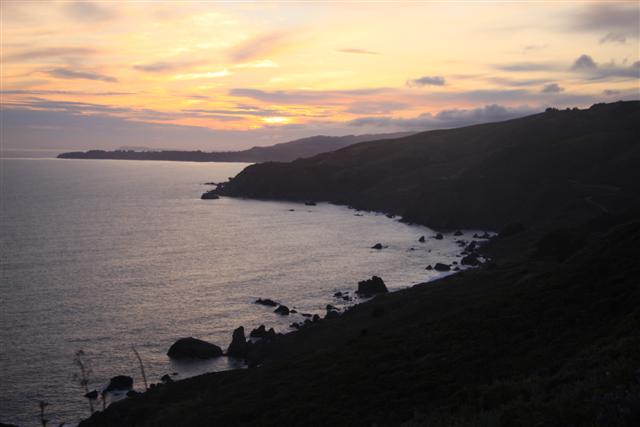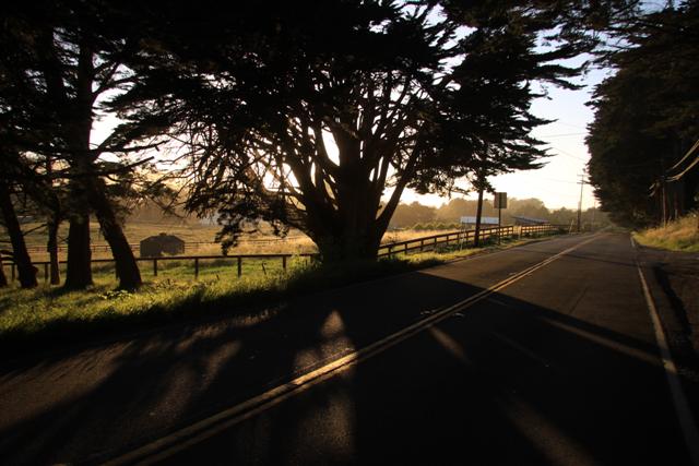 Above: Looking north, into the setting sun between Muir Beach and Stinson Beach from the stretch of CA-1 designated "Shoreline Highway".