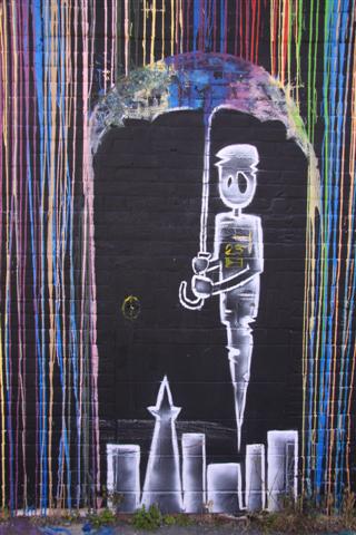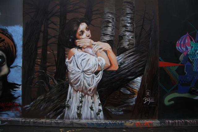 This was surprising to me as I'd assumed that undefended areas like this would be ripe for the surreptitious artists to ply their trades. But I think that the people painting the murals and wheatpasting bizarre prints onto buildings do truly want people to appreciate their efforts. It's not like it's hanging in a prestigious gallery, but they do want their work to be seen and appreciated. These artists are presumably looking for a balance between the risk to display their art and the number of eyes that will view it.