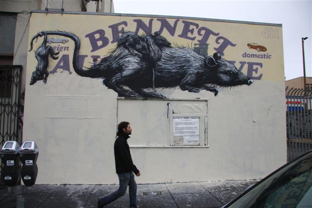 Above: Restoration of iconic mural by Belgian street artist ROA of mother rat with babies at 411 Valencia Street in San Francisco's Mission District.