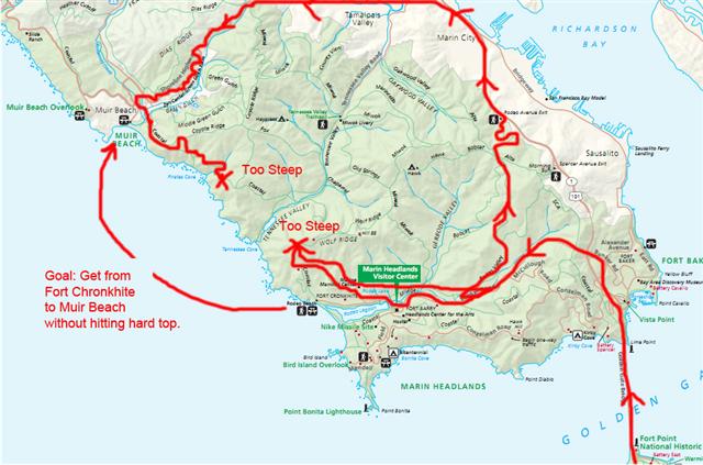 But I've seen paths on Google Earth that appear to connect Point Bonita Lighthouse with Muir Beach. And I'm sort of trying to ferret out the connection. Trying to punch through from the Nike Missile Site to Muir Beach, on-road, off-road, whatever it takes.