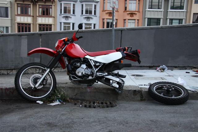 After work, exhausted, driving home on the dirt bike on Larkin Street, I was nearly killed by another motorcyclist. I went to change lanes to my right, and as I glanced back over my shoulder, this guy on a motorcycle came blowing past me in my lane on my right. I nearly cleaned him out. Lane splitting is technically legal in California, but it's suicidal, in my opinion. It's as crazy as it gets.