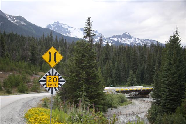 Now, down into the Squamish Valley. All of the signs here are in two languages, but I'm not clear what the other language is. The translation for Squamish valley has a "7" in it though, so maybe they're aliens. I'm not clear.