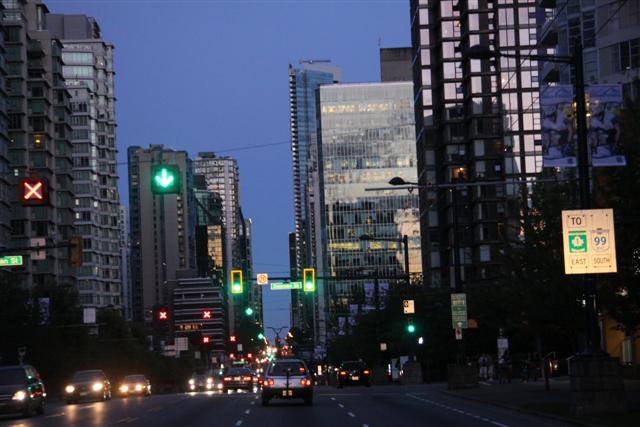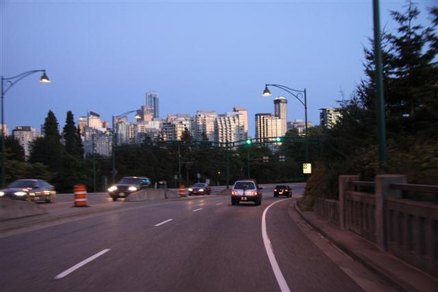 English is not good. Into downtown Vancouver, apparently. Same as me. Across a bridge now and across, down into a forest. So, think about this. We're driving through a rain forest that I doubt you could get through without a machete. A huge forest. And suddenly, we're in Vancouver.