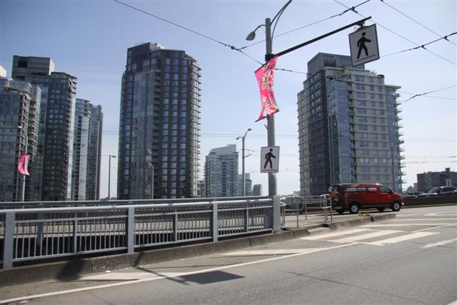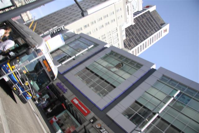 Finally, I quit the hotel and go gas up the bike. Then, to hunt for food. The first guy, a street vendor, doesn't have Diet Coke. Then, to Tim Horton's, but it's after noon so they won't serve breakfast. Finally, I drive around Vancouver until I stumble onto the Granville pedestrian mall, and start driving down it on my dirt bike, of course.