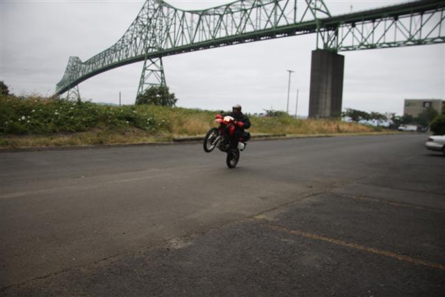Some other bikers stayed in the room next to me and I coax them into taking some shots of me riding wheelies beneath the bridge.