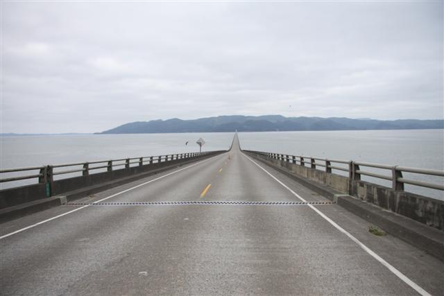 I roll north across the insanely long bridge. It's so long I take photos of it as I roll down the bridge, shooting through the lens while I'm driving. The hard part is that the camera shutter release and the throttle both require the right hand. So, I have to let off the throttle, raise the camera, squeeze off a few rounds through the lens, and then drop the camera and try not to crash.