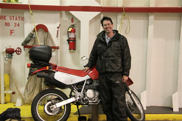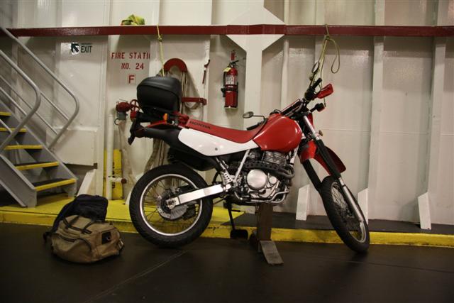 Probably, riding a motorcycle onto a ferry to change countries is about the most manly thing you can do, without leaving the earth's surface. You have schedules. Have to buy tickets. Have to drive from the earth's surface onto a ship. Then block up the bike and tie it down with ropes so the ocean won't knock it over. By the time I get my bike lassoed to the ship's ribcage, I'm drowning in adrenaline. I want to chew nails and throw things. I am cro-magnon man.