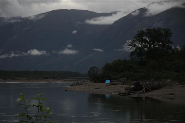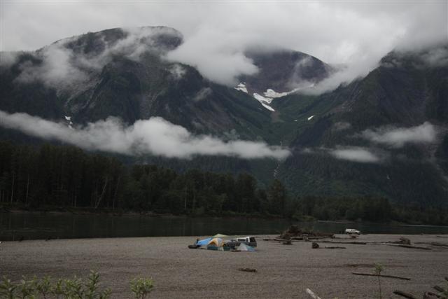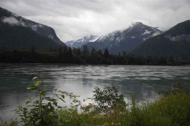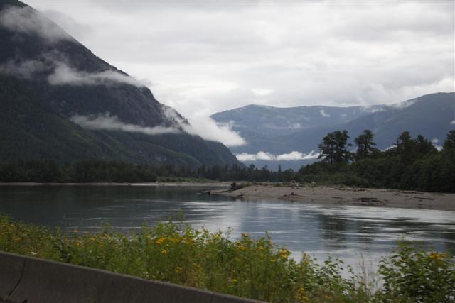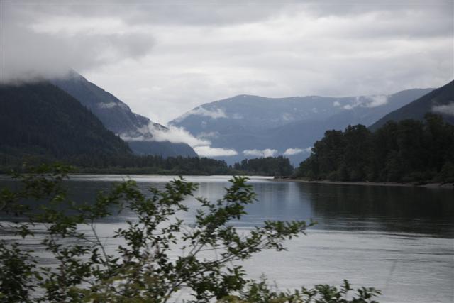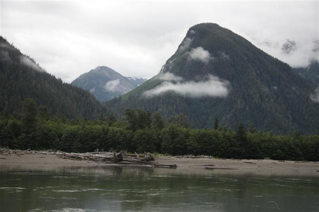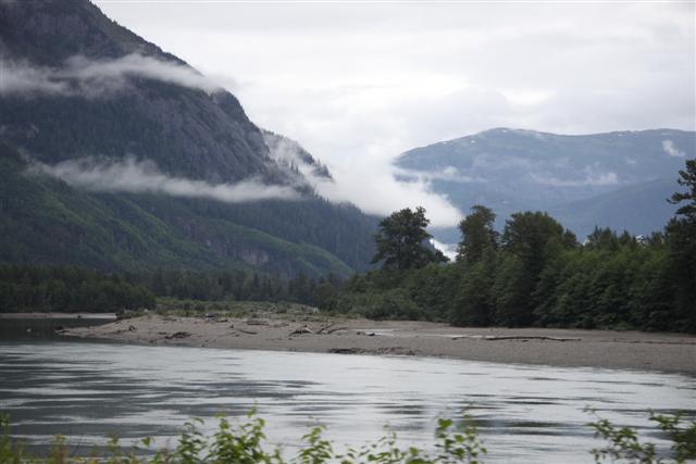 Heaing east, we slowly follow the Skeena River upstream, rising through spectacular mountain ranges, surrounded by low hanging clouds.