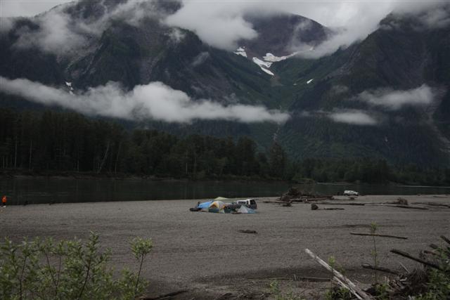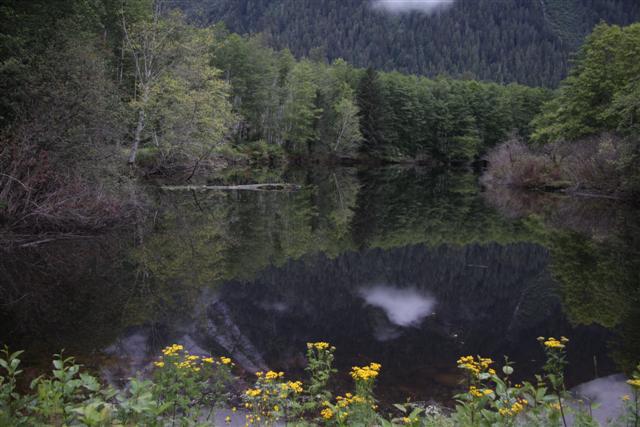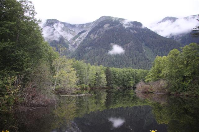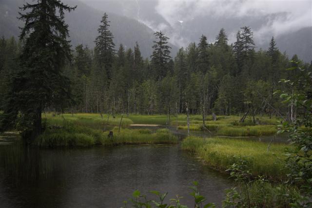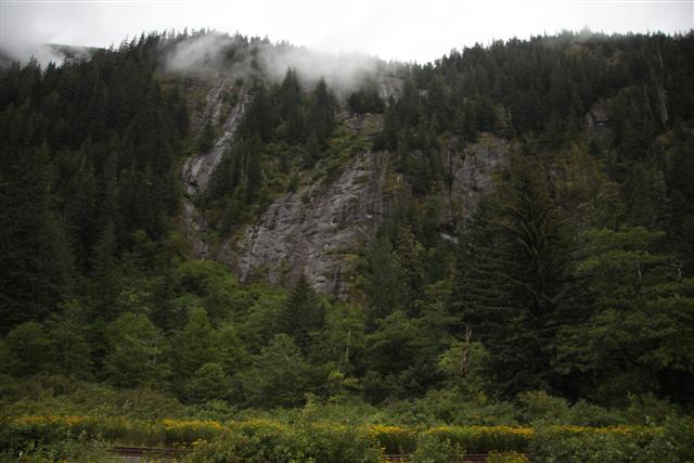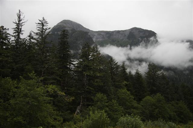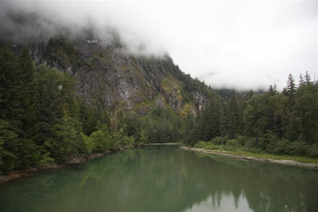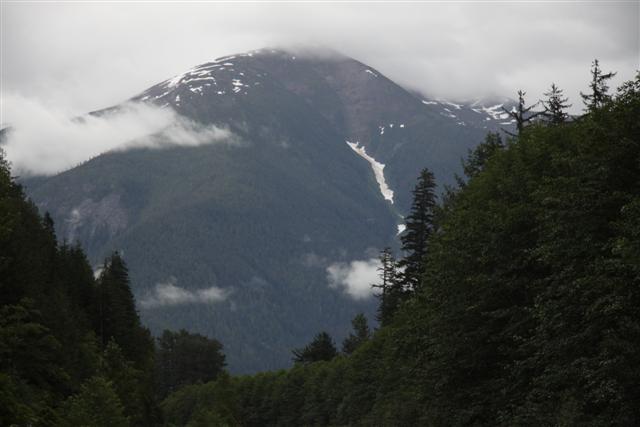 Lunch of Fish and Chips in town, with halibut for the fish this time. Then I roll across the border and into the nearly non-existent village of Hyde, Alaska. Unfortunately, the bar where you can get "Hyderized" is closed on Monday. I drive up to Fish Creek, and nearly run over a bear in the road. But there are no bears at the Fish Creek observation deck.