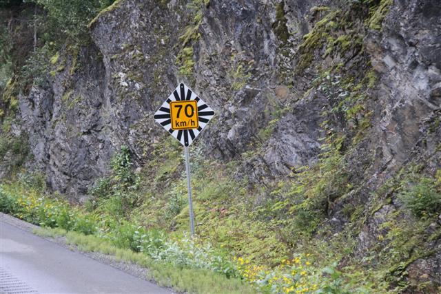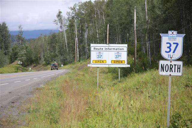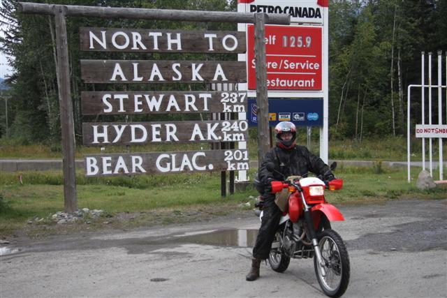 I'm still too cold as I ride along highway 37, so at Meziadin Junction, I turn left onto 37A, and pull over to put on more warm clothes. I can't seem to get warm enough, so I put on everything that I have with me, which isn't much, of course. I'm wearing two pair of pants, long underwear, and an outer waterproof shell of Dri Ducks. Also, two T-shirts, a sweater, a denim shirt, a leather jacket, and an outer waterproff shell of Dri Ducks.