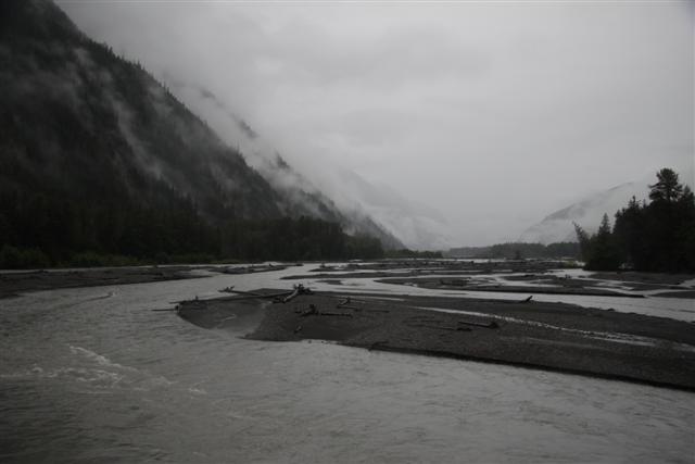 In the morning, I awake alone to the sounds of a dull rain on the hotel roof, just across the border from Hyder, Alaska. The rain seems to own this town. It's cold outside, unseasonally so I'm told. They say they never really had a summer this year. It's been cold and rainy all summer. They've only seen the sun 3 times this year, they claim.