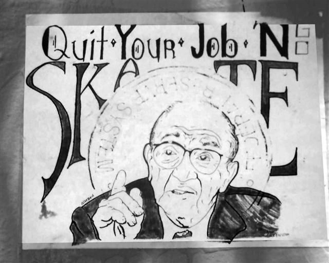 I saw a wheatpaste by "Alleged" in the mission with Greenspan saying "Quit Your Job and Skate" and I thought...that's about right. Sort of the mantra of the counter-culture. Instead of the "He who dies with the most toys wins!", it's more of a "Life is short, Play hard" type of approach. One that seems more and more alluring as one spends day after day shuffling through the airports and offices, always wondering what's up ahead? Is it salvation, or spinning blades?