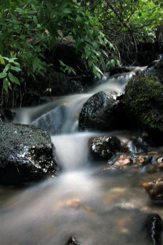 I try to set up the camera to get a shot of the creek where we camp. I prop it up on my old-skool pink RAZR phone, and the phone promptly slips into the creek. The screen starts going nuts, but I just pop the battery out and tell her it will be fine. It's not like it's an iphone, after all.