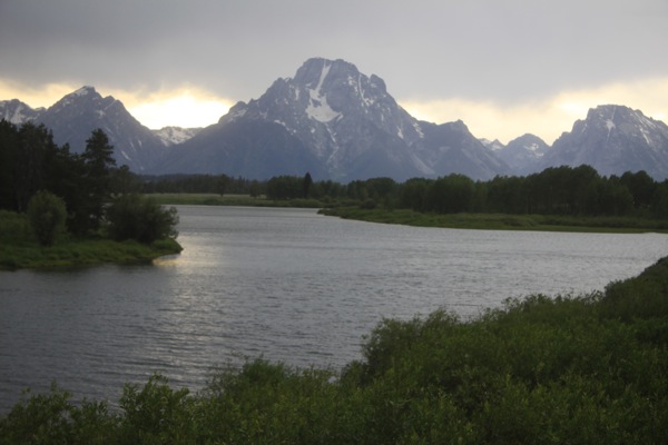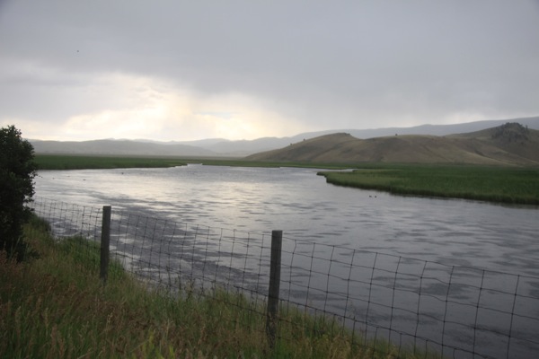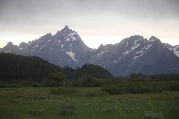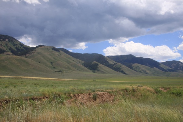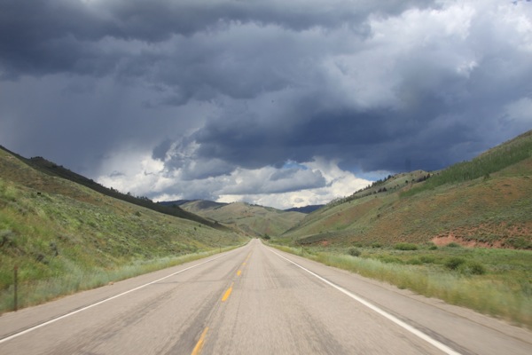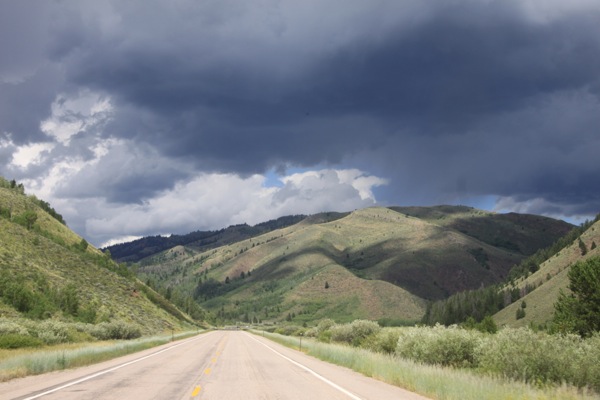 Now, rolling north before the fabled Teton mountain range. It's raining, but somehow I'm surfing the front of the storm. So that, if I stop to shoot, I get wet. The storm is chasing me north. So, I'm rolling north. Snap a few pics of the tetons, and they disappear into a massive rainstorm.