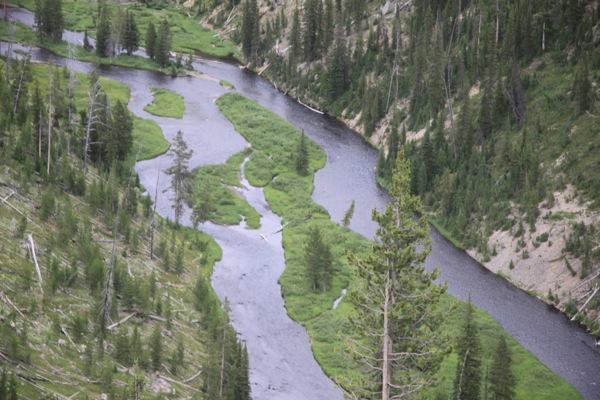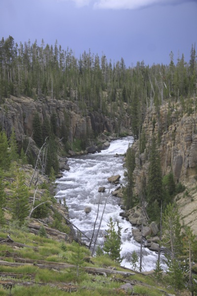 Finally, he lets me go. I roll north, it rains. It stops. It rains more. Get into Yellowstone National Park. Now, I stop to shoot this creek/river. Beautiful shot. But when I get back on my bike, the bike starts, but dies when I put it in gear. It's done this to me once before. I don't know what to make of it. The bike starts and runs fine, but when I put it in gear, even with the clutch still in, it immediately dies. Oh...and my iPhone isn't working.