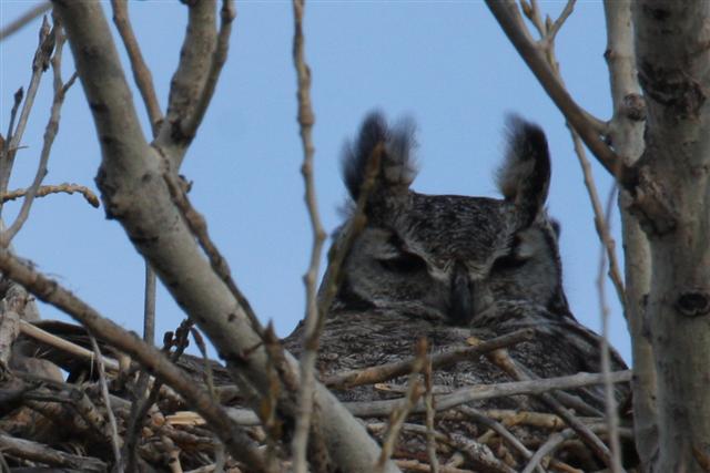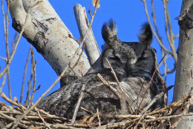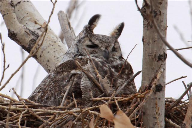 Above: Great Horned Owl (Bubo virginianus) incubates a clutch of eggs. My guestimation is that they will hatch on or around March 11th.