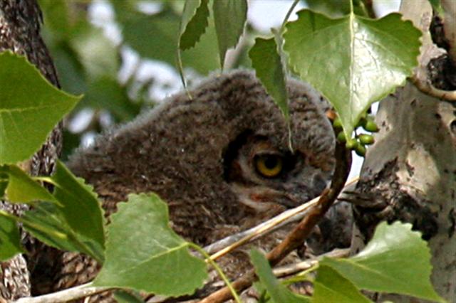 Here's a photo of the Great Horned Owlet that I shot today. This one looks a little better than the last one, but not by a great margin. You can see one of the owlet's eyes, and his (or her) beak. I'm surprised by how quickly the bird is maturing.