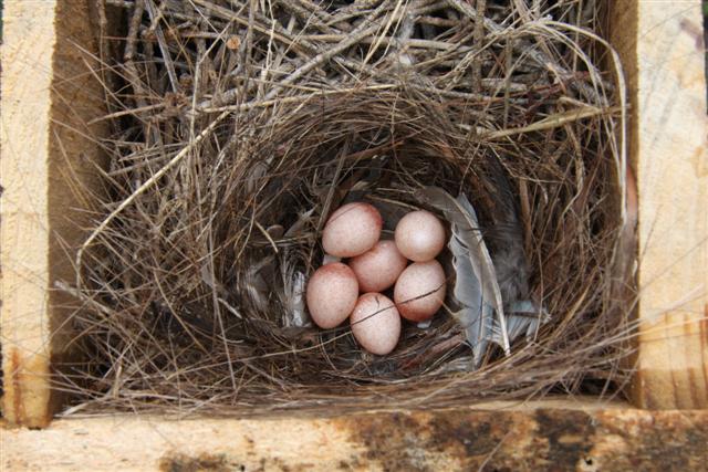 The House Wren added yet another egg to her clutch. I have to think she'll stop laying eggs and start incubating them in the next day or so. Both Western Bluebird moms are incubating their eggs.