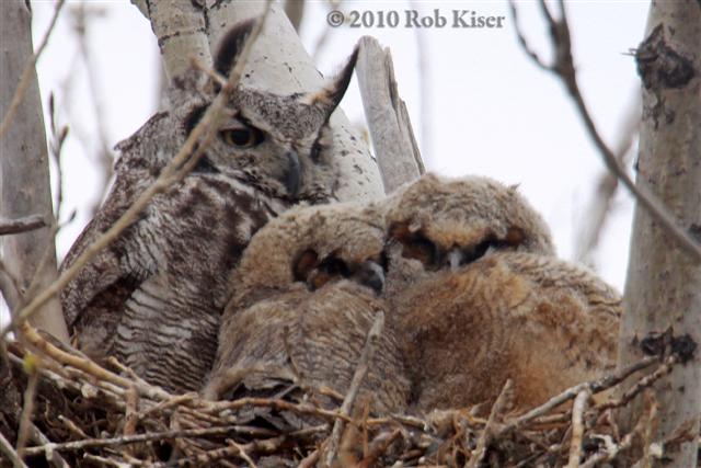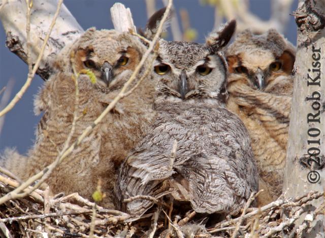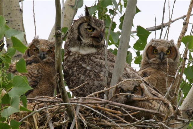 Finally, a photo of the Great Horned owlets with a parent in the nest for perspective.