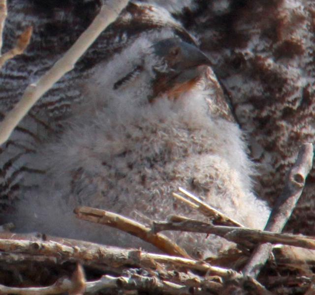 My best estimate as to when the owlet was born is March 14-17, meaning that in this photo taken March 26th, the owlet would be approximately 9-12 days old.
