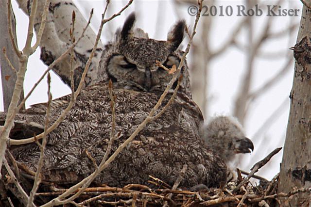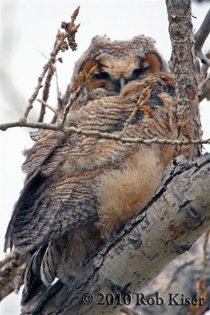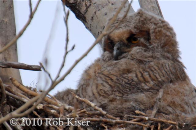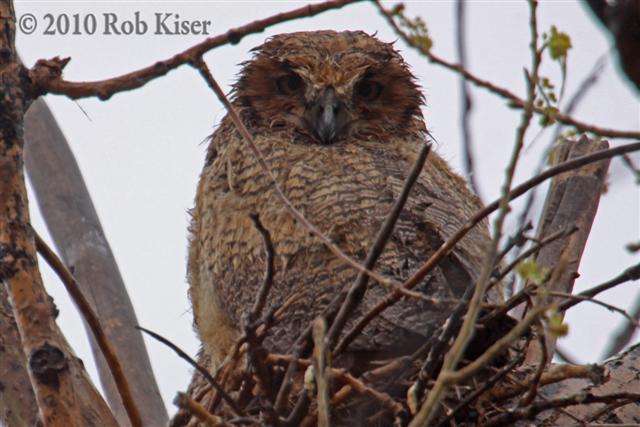 Above: A single Great-horned owlet suffers through a late spring storm. Both owlets were in the nest, sans mom, but I couldn't get a decent shot of both of them together. They were standing facing roughly east, with their backs to the weather, as they were pelted by snow and rain.