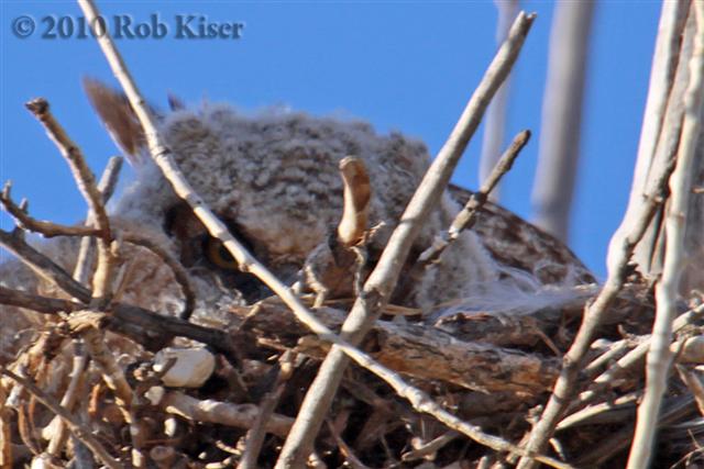 Yesterday, when I brought Jennifer home from the airport, we stopped to check on the Great Horned Owl nest and, for the first time this year, I spotted a baby owl. The owlet is snow white and appears to be covered in down. The baby was eating something when I spotted him. I snapped a few Bigfoot/UFO quality photos of the baby, but you can see the little bugger if you look closely. It's the white little furry thing behind the momma owl.