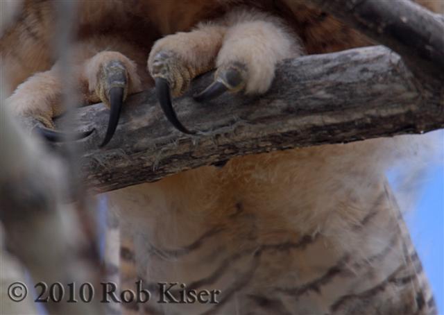 I went down yesterday to try to get some photos of the owlet. Mostly, they were sort of "UFO-Bigfoot quality photos", unfortunately. What I see is an owlet, that appears to be fairly mobile, living mainly beneath the mother's wing, but coming out to feed occasionally. I suspect that the father hunts at night for prey, brings it by and drops it off. Probably he does this all night. Then, around dawn, he flies off somewhere to perch and sleep through the day.